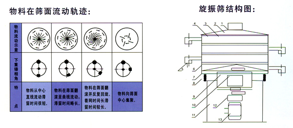 普通電機(jī)旋振篩是通過軟聯(lián)接傳動(dòng)機(jī)械,帶動(dòng)重錘激振,使篩體產(chǎn)生復(fù)旋型振動(dòng),此振動(dòng)軌跡為—復(fù)雜的空間立體曲線,從而使篩體產(chǎn)生篩分作用,調(diào)節(jié)上下重錘的空間相位角,可以改變物料在篩面上的運(yùn)動(dòng)軌跡。
